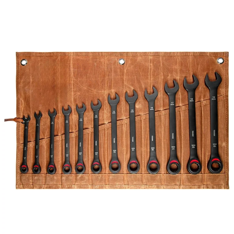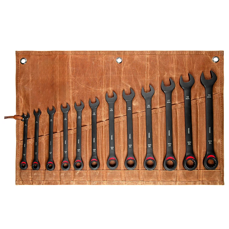 Combination Ratcheting Wrench Set: 12-Piece Metric 8-19mm CR-V Steel Tough Wax Canvas Storage Bag for Off-Road Tool Kits